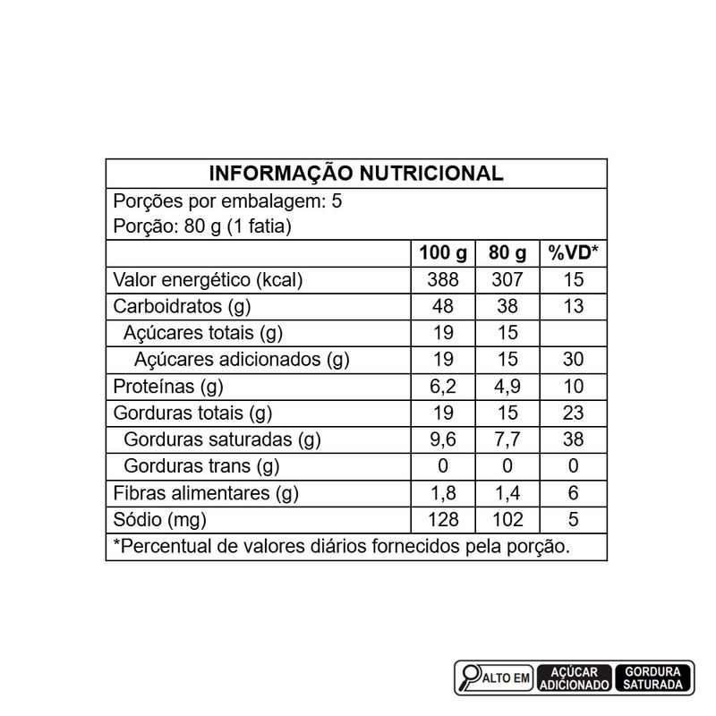 Farinha de trigo enriquecida com ferro e ácido fólico, gotas de chocolate ao leite, açúcar, gordura vegetal, ovo integral pasteurizado, gema de ovo pasteurizada, manteiga sem sal, açúcar invertido, glúten de trigo, leite em pó integral, sal, extrato de malte de cevada, emulsificantes: mono e diglicerídeos de ácidos graxos e lecitina de soja, umectante glicerol, aromatizantes, conservadores: ácido sórbico e propionato de cálcio e corante beta-caroteno sintético. ALÉRGICOS: CONTÉM OVOS E DERIVADOS DE TRIGO, LEITE, SOJA, CEVADA E OVOS. PODE CONTER AMENDOIM, AMÊNDOA, AVELÃS, AVEIA, CASTANHA-DE-CAJU, CASTANHA-DO-BRASIL, NOZES, CENTEIO, PISTACHES, MACADÂMIAS E PECÃS. CONTÉM LACTOSE. CONTÉM GLÚTEN.