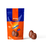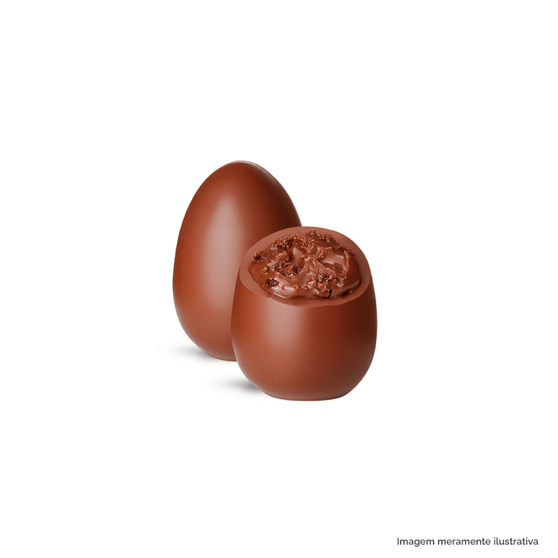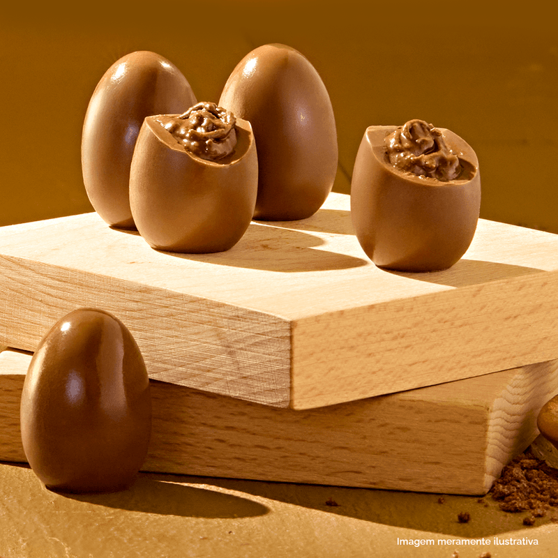 Mini ovinhos de chocolate ao leite com Recheio Crocante com Ovomaltine® (alimento com extrato de cereal (cevada e malte) sabor chocolate) e avelã.