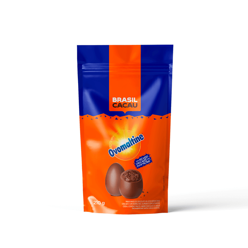 Mini ovinhos de chocolate ao leite com recheio Crocante com Ovomaltine® (alimento com extrato de cereal (cevada e malte) sabor chocolate) e avelã.