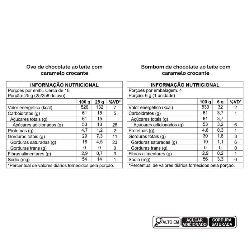 Ingredientes: açúcar, manteiga de cacau, caramelo crocante, pasta de cacau, leite em pó integral, gordura vegetal, soro de leite em pó parcialmente desmineralizado, cacau em pó, emulsificantes: lecitina de soja e poliglicerol polirricinoleato e aromatizante. ALÉRGICOS: CONTÉM DERIVADOS DE LEITE E SOJA. PODE CONTER AMENDOIM, AMÊNDOA, AVELÃS, CASTANHA-DE-CAJU, CASTANHA-DO-BRASIL, MACADÂMIAS, NOZES E PISTACHES. CONTÉM LACTOSE. NÃO CONTÉM GLÚTEN.