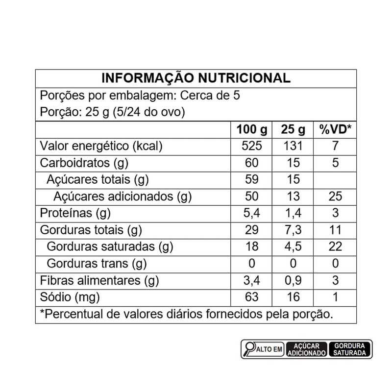 açúcar, manteiga de cacau, pasta de cacau, leite em pó integral, gordura vegetal, soro de leite em pó parcialmente desmineralizado, cacau em pó, emulsificantes: lecitina de soja e poliglicerol polirricinoleato e aromatizante. ALÉRGICOS: CONTÉM DERIVADOS DE LEITE E SOJA. PODE CONTER AMENDOIM, AMÊNDOA, AVEIA, AVELÃS, CASTANHAS, CASTANHA-DE-CAJU, CASTANHA-DO-BRASIL, CENTEIO, CEVADA, MACADÂMIAS, NOZES, PECÃS, PINOLI, PISTACHES, OVOS E TRIGO. CONTÉM LACTOSE. CONTÉM GLÚTEN.