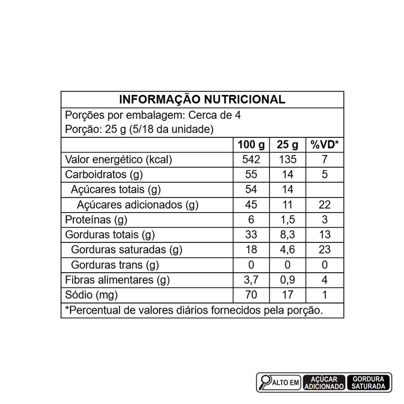açúcar, manteiga de cacau, pasta de cacau, leite em pó integral, gordura vegetal, soro de leite em pó parcialmente desmineralizado, cacau em pó, creme de leite em pó, emulsificantes: lecitina de soja, triestearato de sorbitana e poliglicerol polirricinoleato e aromatizantes. ALÉRGICOS: CONTÉM DERIVADOS DE LEITE E SOJA. PODE CONTER AMENDOIM, AMÊNDOA, AVELÃS, CASTANHA-DE-CAJU, CASTANHA-DO-BRASIL, MACADÂMIAS, NOZES E PISTACHES. CONTÉM LACTOSE. NÃO CONTÉM GLÚTEN.