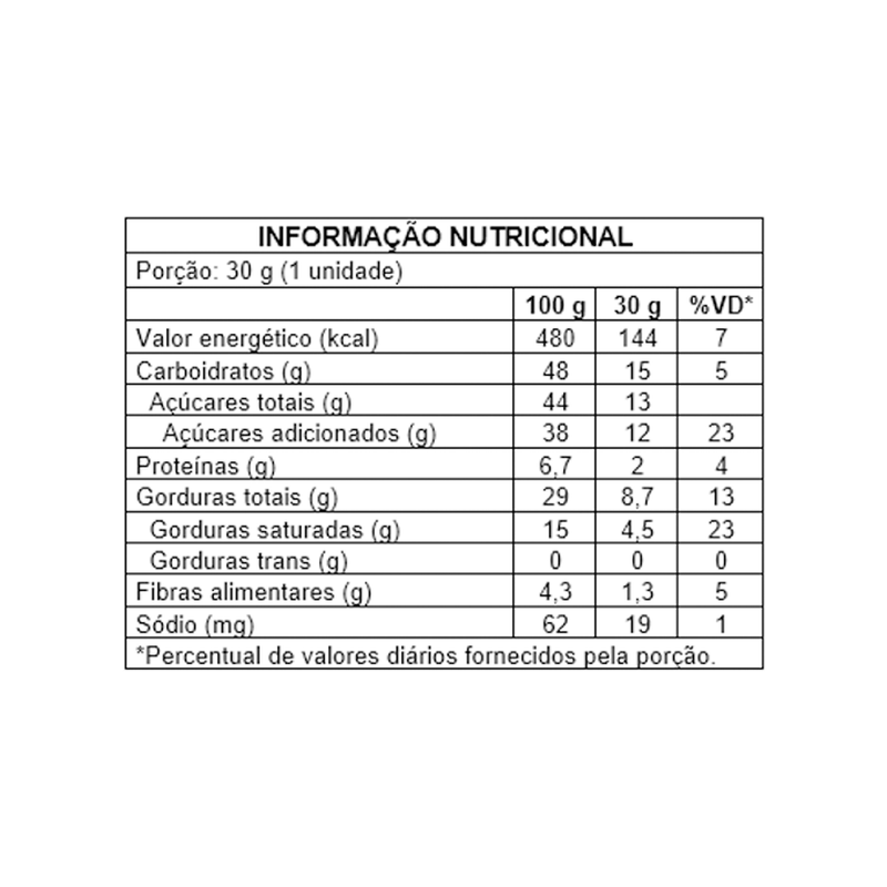 Ingredientes: açúcar, gordura vegetal, leite em pó integral, cacau em pó, manteiga de cacau, pasta de cacau, soro de leite desmineralizado, creme de leite em pó, emulsificantes: triestearato de sorbitana, lecitina de soja e poliglicerol polirricinoleato e aromatizantes. ALÉRGICOS: CONTÉM DERIVADOS DE LEITE E SOJA. PODE CONTER AMENDOIM, AMÊNDOAS, AVELÃ, CASTANHA-DE-CAJU, CASTANHA-DO-BRASIL, MACADÂMIA, NOZES E PISTACHE. CONTÉM LACTOSE. NÃO CONTÉM GLÚTEN.